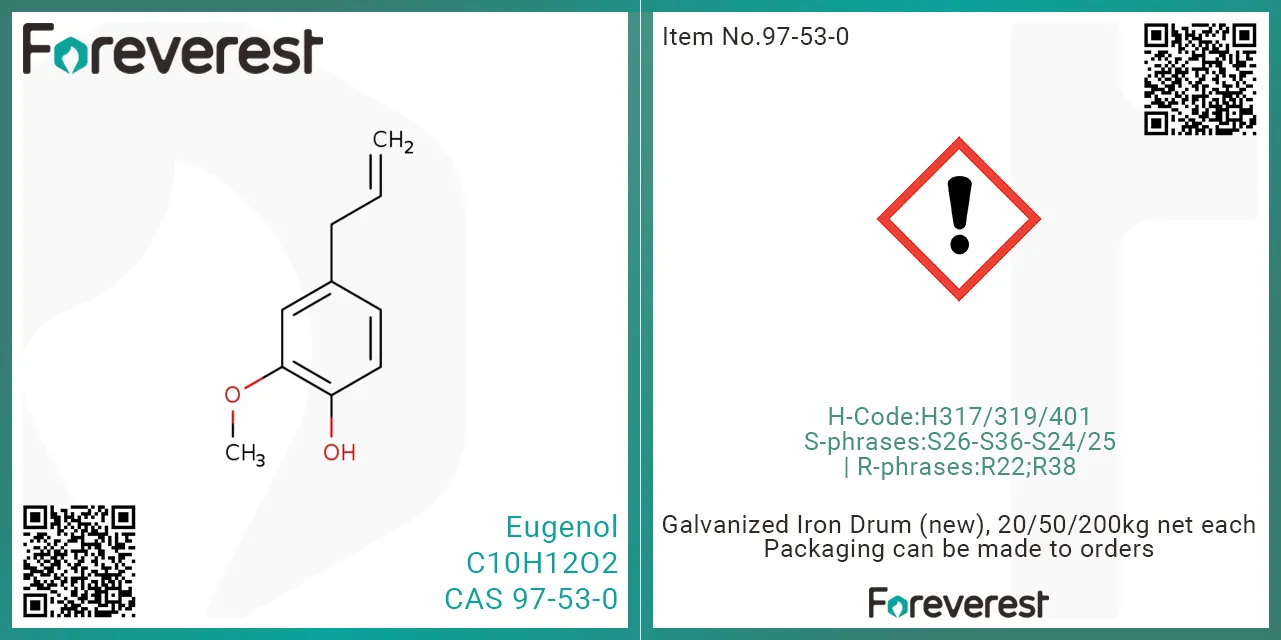 Eugenol is naturally found in clove oil, clove basil oil and cinnamon oil. It appears colorless to pale yellow liquid with dry sweety and clove odor. Eugenol is an important fragrance ingredient.