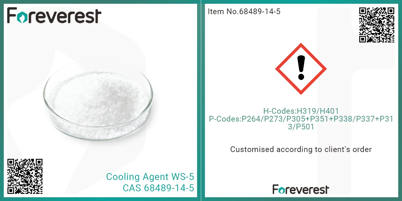Cooling agent WS-5 (N-((ETHOXYCARBONYL)METHYL)-P-MENTHANE-3-CARBOXAMIDE) is a powerful synthetic coolant used to provide a cooling sensation in various products. WS-5 delivers a potent (Strength 4) and lasting cooling effect (about 10 minutes).
