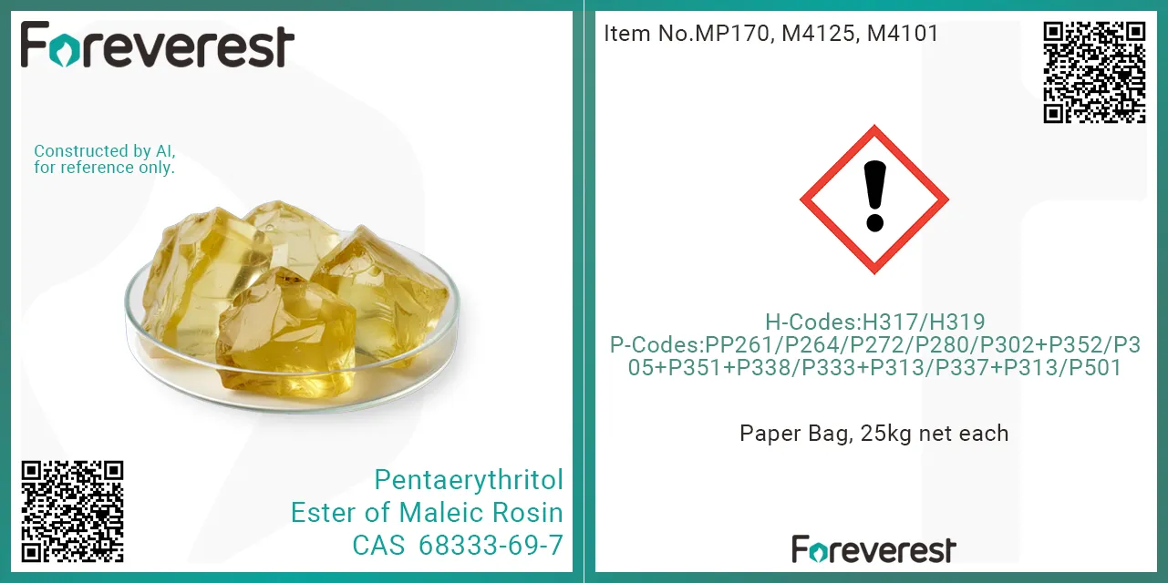 Maleic Modified Rosin Resin, Pentaerythritol ester of maleic rosin or Rosin Modified Maleic Resins is a light yellow transparent solid, which is synthesized by the addition reaction between gum rosin and maleic anhydride, then through the esterification with pentaerythritol. It is widely used in ink industry.