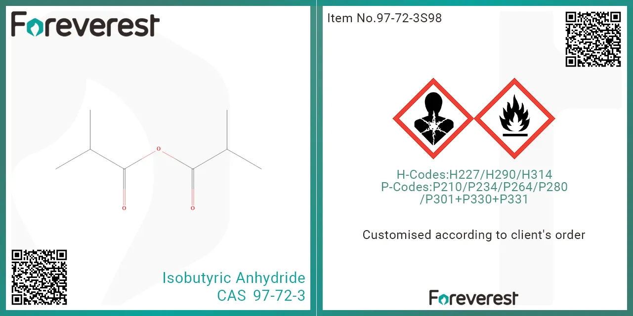 异丁酸酐为无色液体,有刺激性、刺鼻气味,是异丁酸的无环羧酸酐。 异丁酸酐用作蔗糖乙酸异丁酸酯等酯类的原料。 它还用作染料、农用化学品和其他化学品的原料。