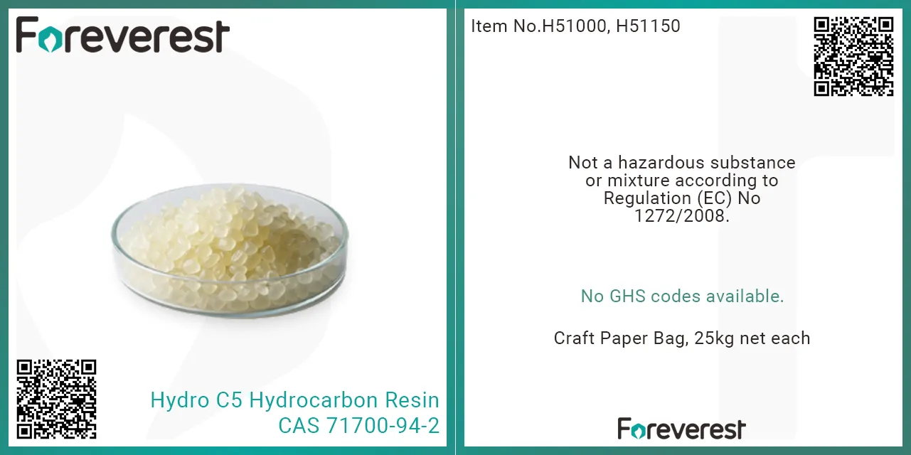 Foreverest® H51000 是种由C5聚合加氢精制而得的水白色热塑性石油树脂。主要用作增粘剂、连接料和增塑剂应用。由于其相容性能相比较传统C5石油树脂更具稳定,能够在高温下持久保持聚合物的内聚力强度,尤其适合热熔胶(HMA)、热熔压敏胶(HMPSA)、玻璃强化、汽车部件和高级橡胶制品。