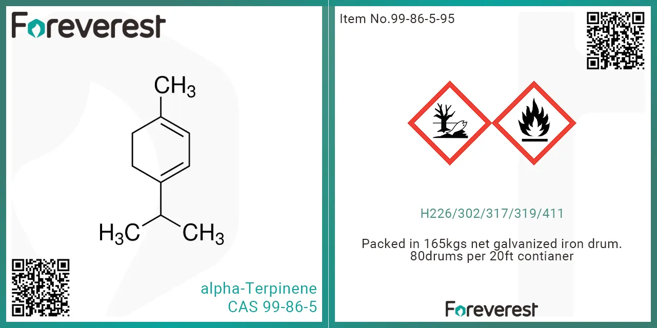 α-松油烯为单萜碳水化合物,天然存在于植物精油当中。是蒎烯合成松油醇樟脑等香料时必然生产的副产物。具有环内共轭双键结构,可与亲双烯体(如乙醛、丙烯醛等)加成,进一步合成木香型、花香型、龙涎香型等香型的加成环化产物;亦可应用于医药或电子焊接剂等领域。